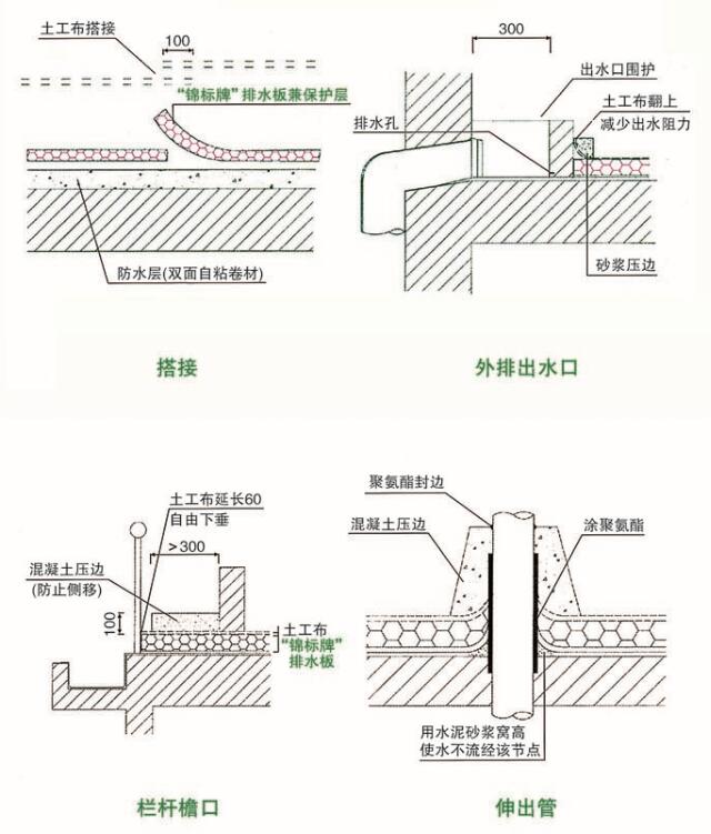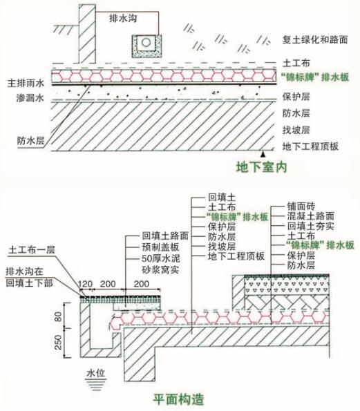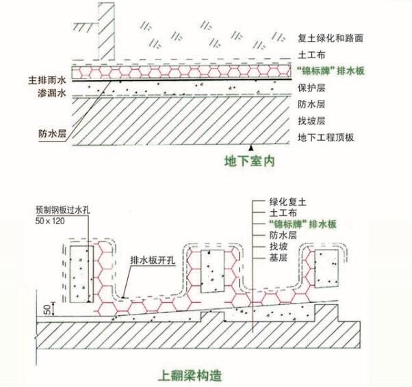 6、車庫頂上有反梁,雙是方排水板在鋪設時可以把整個大梁包住,使每卷排水板整體鋪過去,梅根大梁底部的洞口要處理好。排水板撲到洞口時應該把排水板底板對準洞口開一個洞,土工布保持整體。